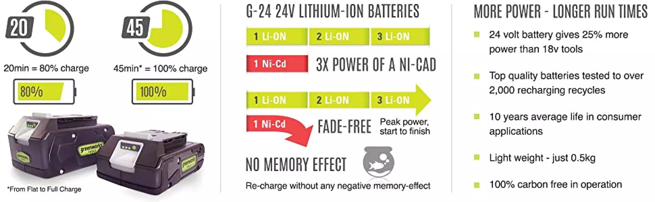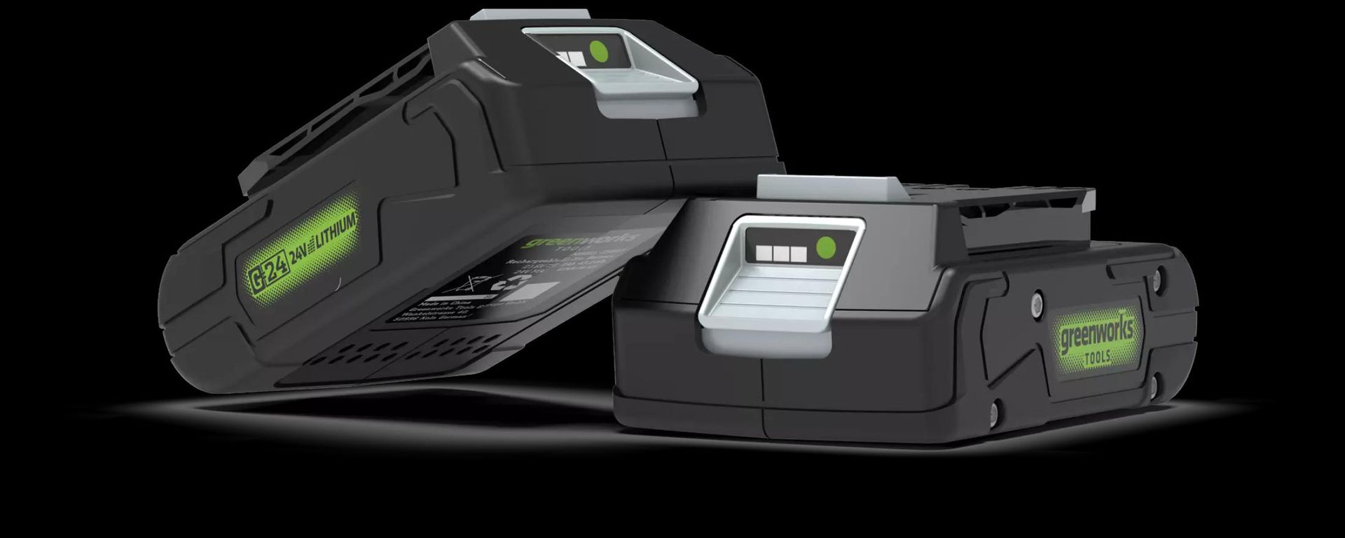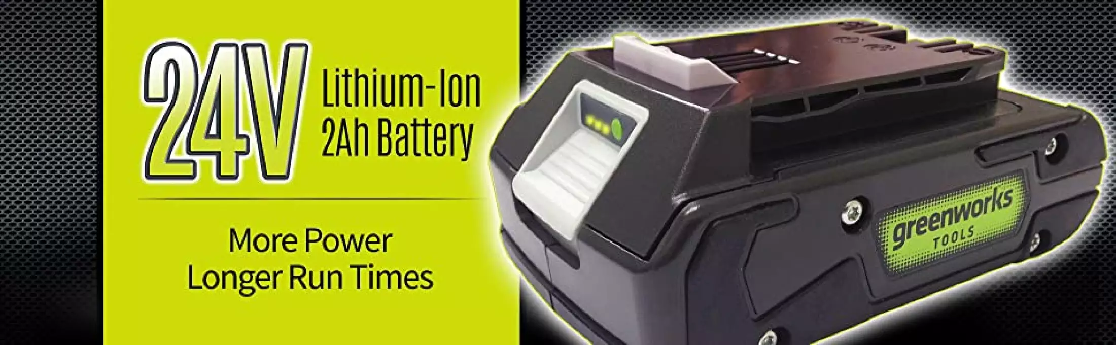 Greenworks G24B2 is a lithium-ion (Li-ion) high capacity battery of 2 Ah of the latest generation, made using the latest technology and used in Greenworks G-24 24V technology .