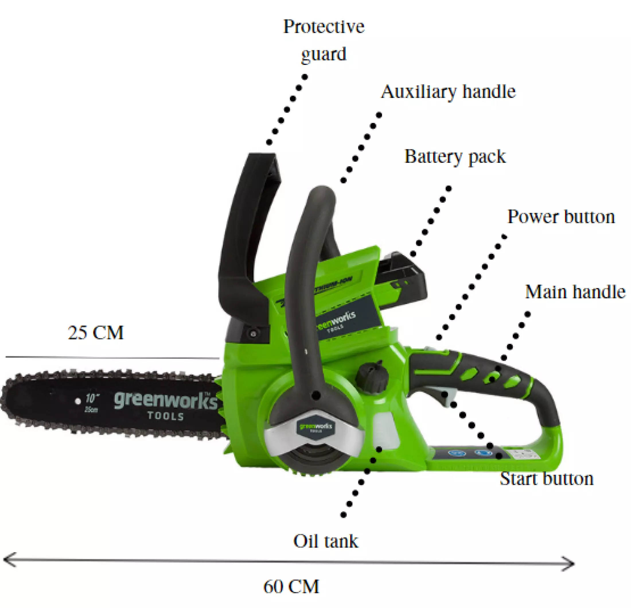 - Greenworks G24CS25 is a cordless chainsaw that have 25cm long saw bar that has a compact size, lightweight and ideal for simple household tasks.