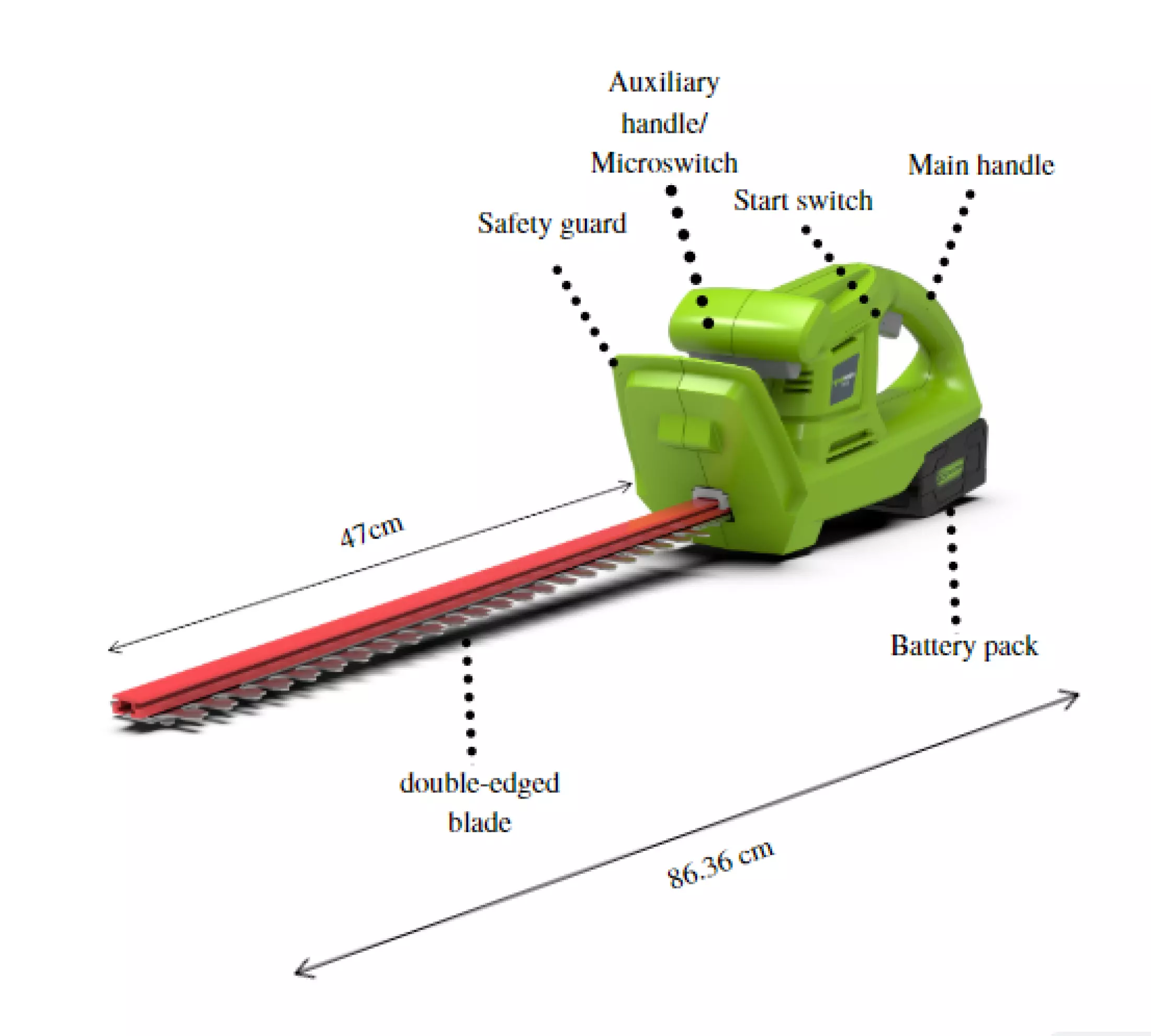 - This hedge trimmer provides a long autonomous operation thanks to the power supply from the 24V battery.
