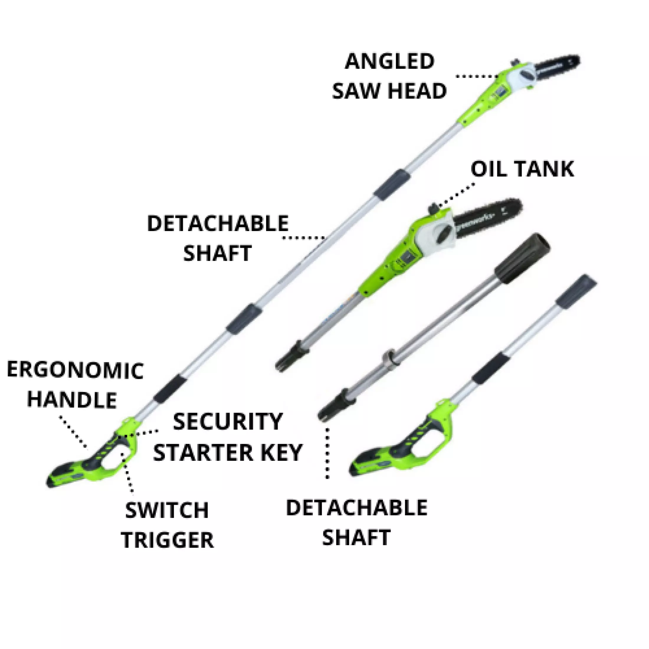 - With the Greenworks G-Max 24V cordless pole saw on stem type (long-range) type G24PS20, you have a powerful cordless branch saw with a long reach.
