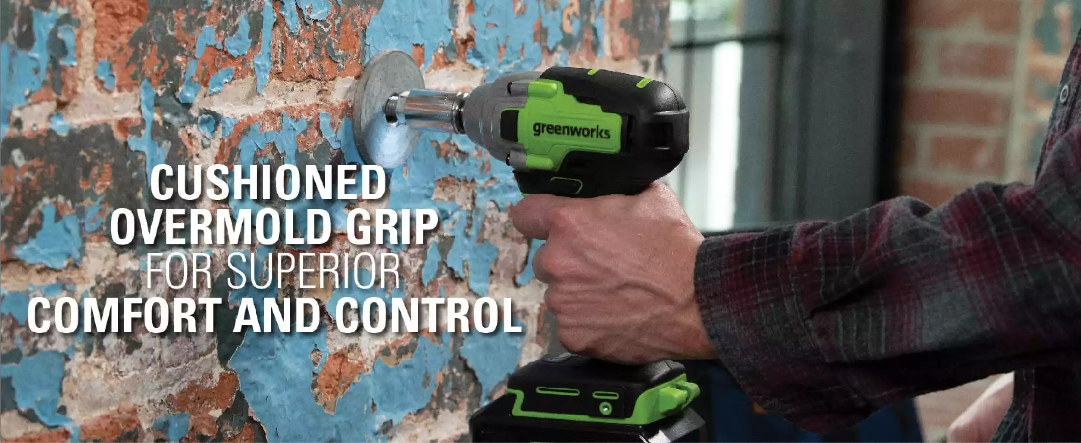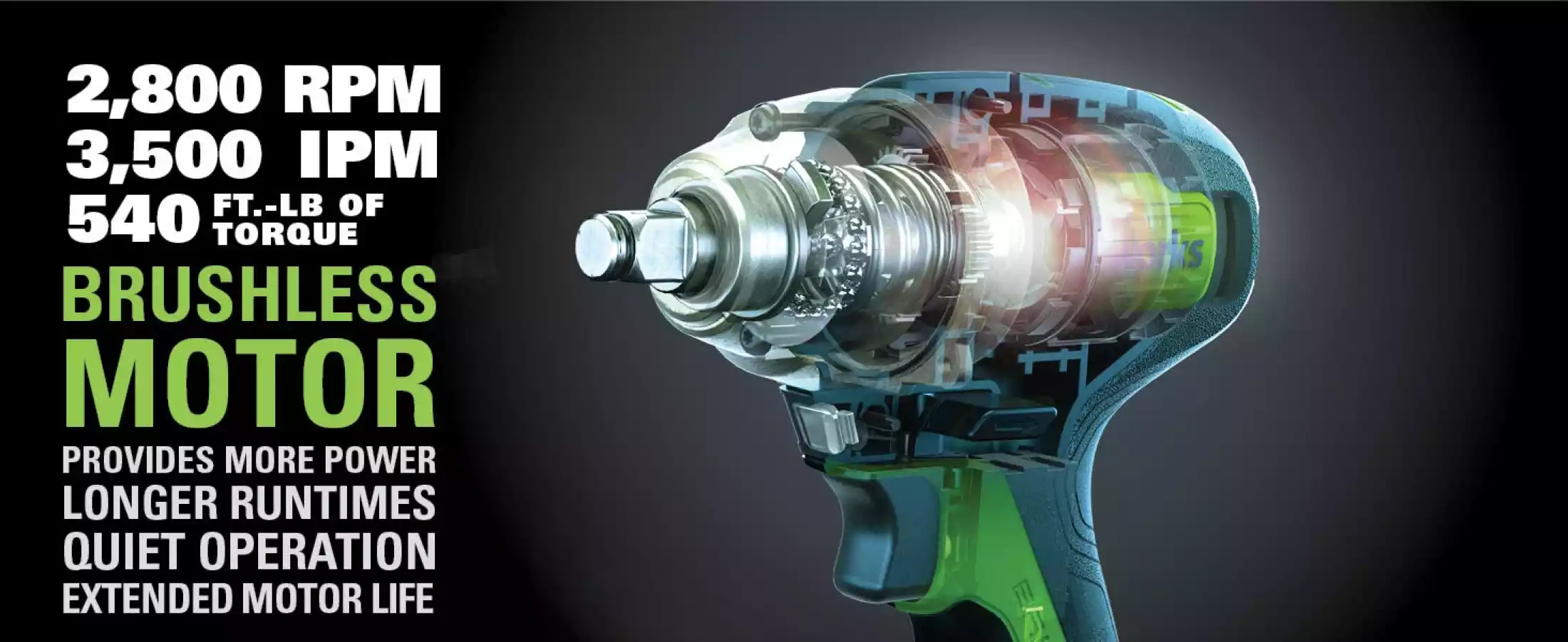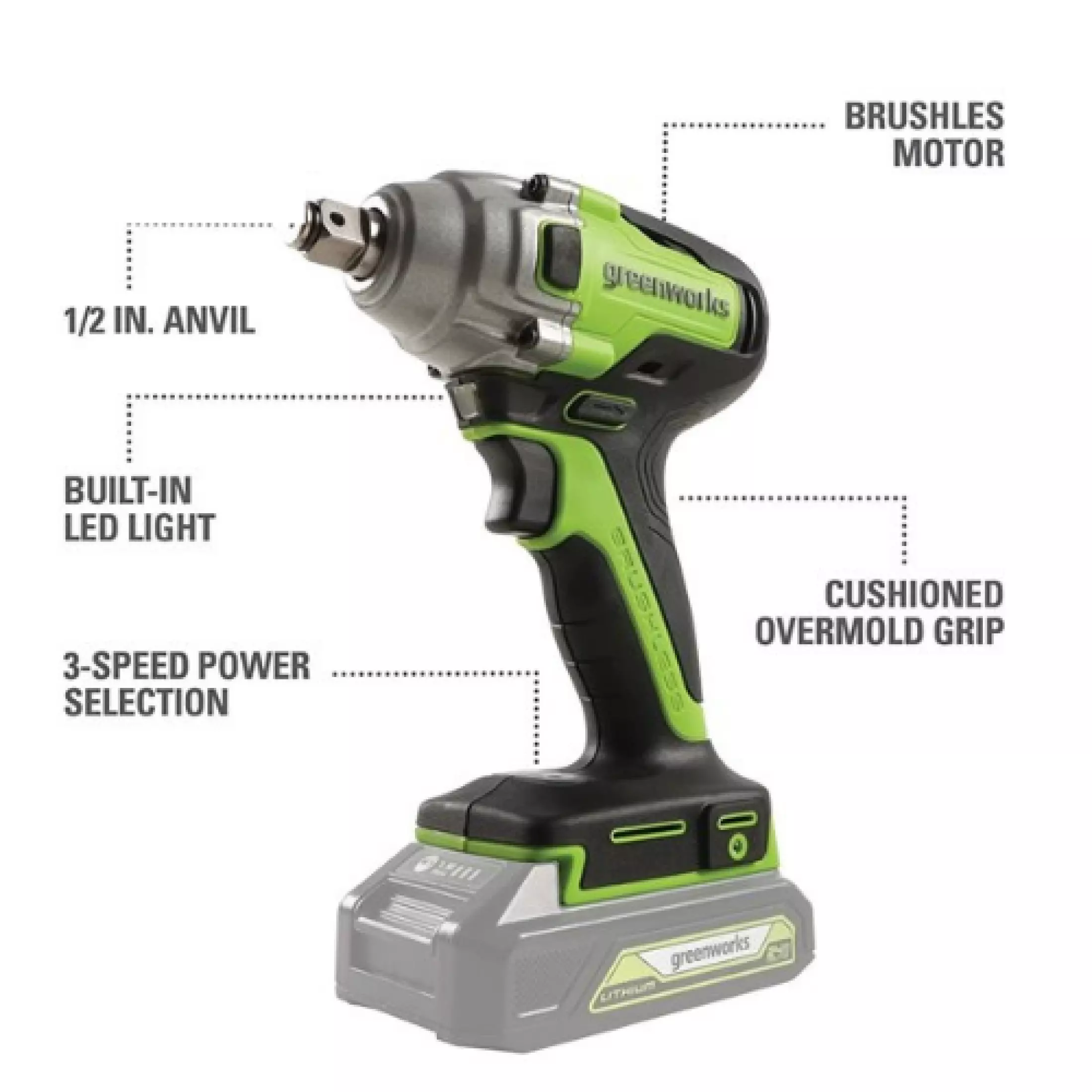 4V Brushless motor provides more torque, quiet operation and longer life. Tighten and loosen the most stubborn nuts and bolts with the 24V Brushless 1/2" Impact Wrench from Greenworks. At up to 540ft-lb of torque, this impact wrench is powerful - while remaining compact for any application. Greenworks 24V lithium-Ion battery provides 20% more power and 35% more run-time, and delivers fade-free power with no memory loss after charging.