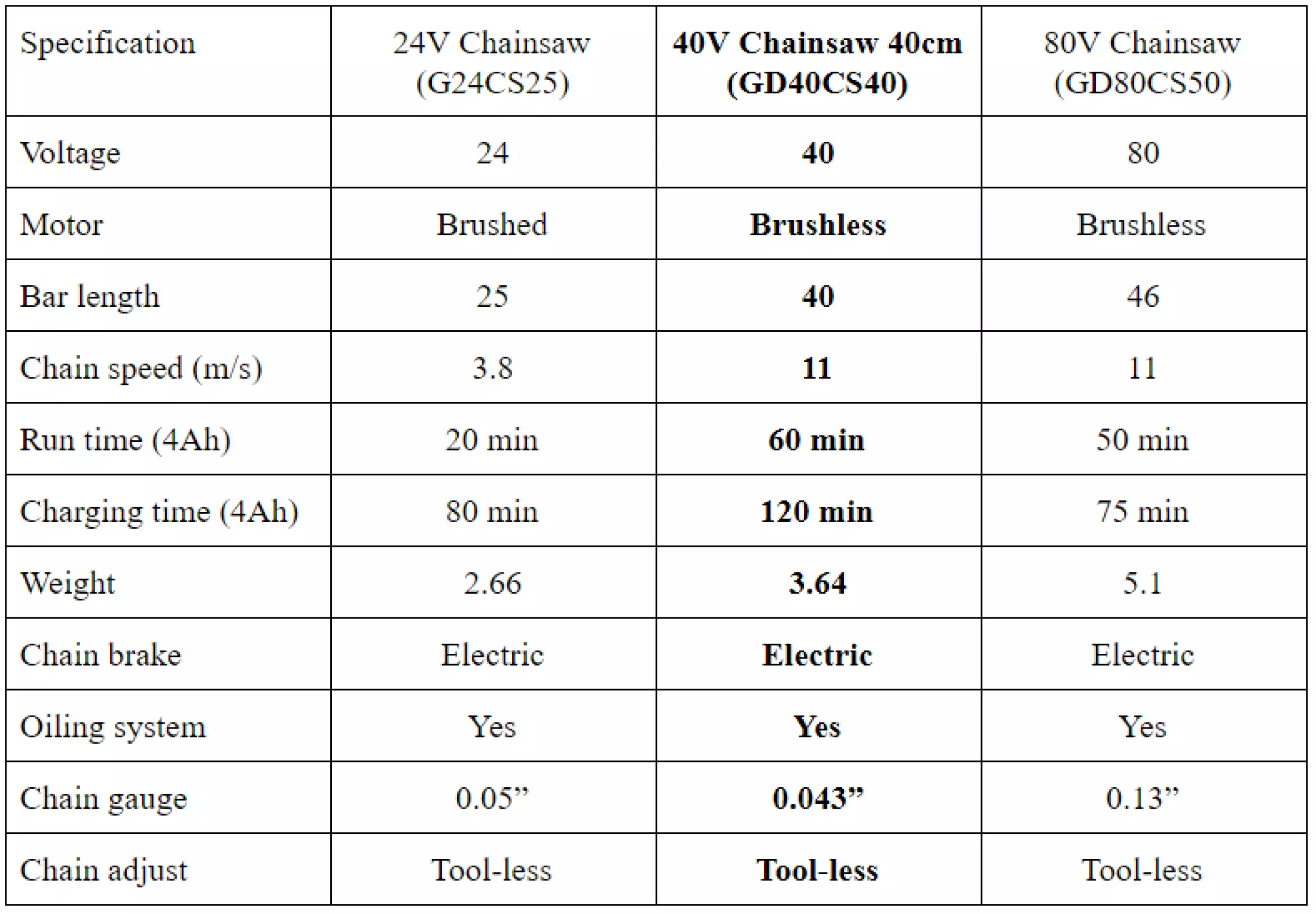 - GD40CS40 is a semi-professional cordless chainsaw model for forest management.