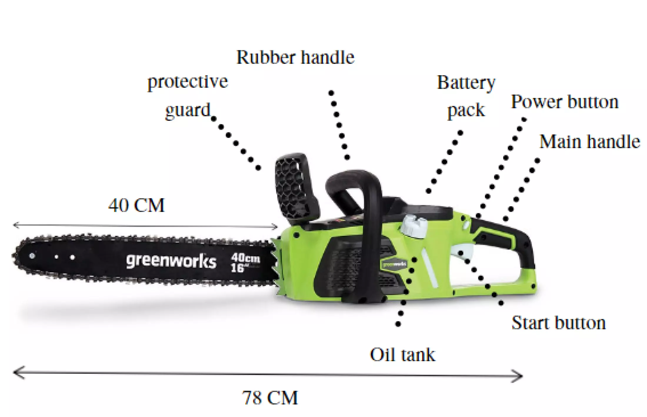 - For safe operation, the saw is equipped with a power button, a safety catch and chain brake. The chain brake functions as shield that can protect your hands from flying sawdust.